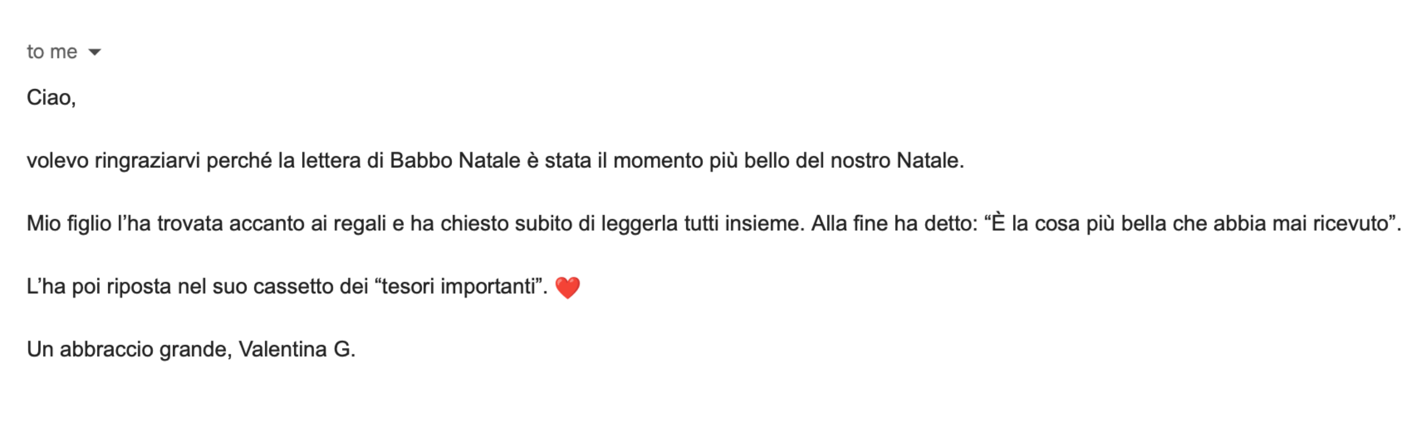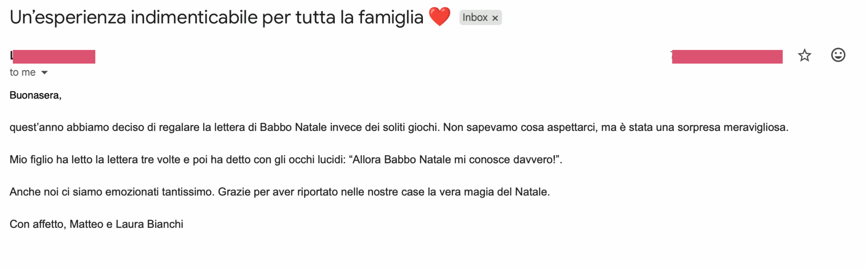 Per i nostri clienti fedeli che hanno effettuato un ordine anche lo scorso anno, questa volta abbiamo preparato una versione leggermente diversa: il design (colori, testo) è cambiato, al posto dei semi magici del Polo Nord c'è una foto autografata di Babbo Natale e anche la ricetta è nuova. Quindi non preoccupatevi: vostro figlio non riceverà una lettera identica da Babbo Natale.